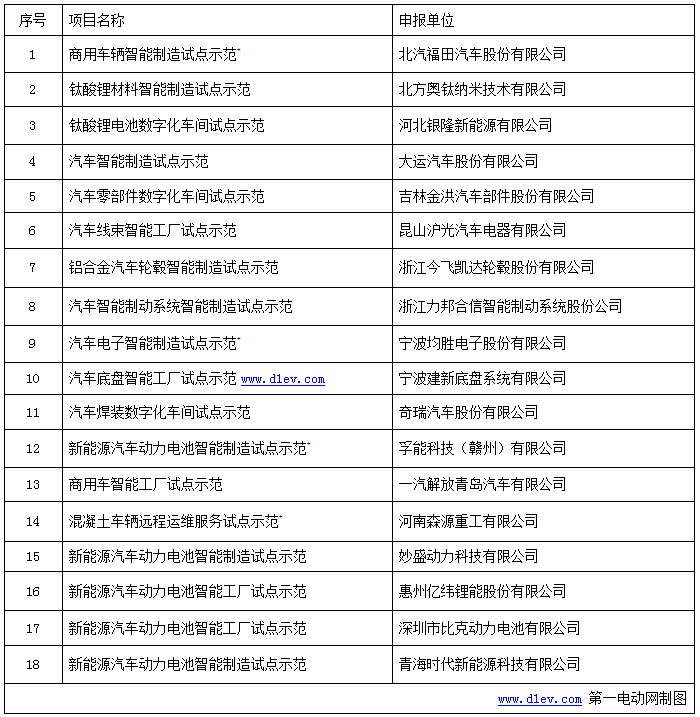 9月14日,工信部公示2017年智能制造试点示范项目,共有98家单位申报智能制造试点项目。其中18家单位申报了汽车类项目,7家单位申报了新能源汽车动力电池项目,包括钛酸锂材料智能制造试点示范、钛酸锂电池数字化车间试点示范、新能源汽车动力电池智能制造试点项目等。