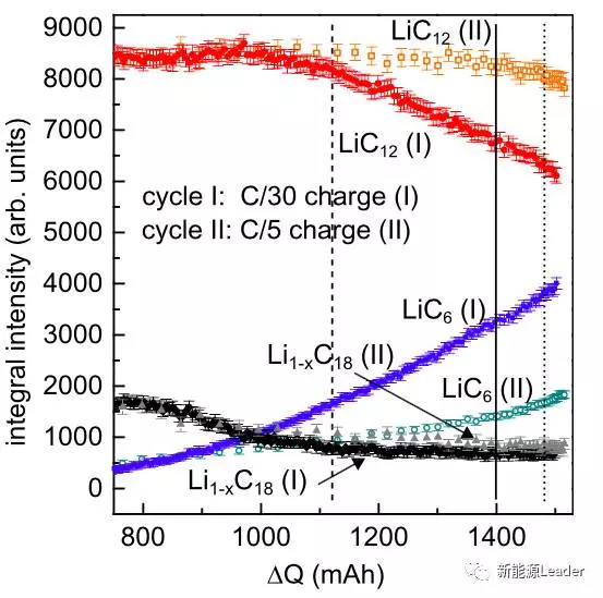 下图为在-20℃低温下,按照C/5倍率充电的过程中,负极石墨的物相变化,可以看到,相比于C/30倍率充电,石墨的物相变化有着明显的不同,从图上可以看到,在SoC>40%时,C/5充电倍率下电池LiC12物相的强度降低要明显较慢,LiC6物相强度升高也要明显弱于C/30倍率充电,这表明在C/5相对较高的倍率下,更少的LiC12持续嵌锂,转换为LiC6。