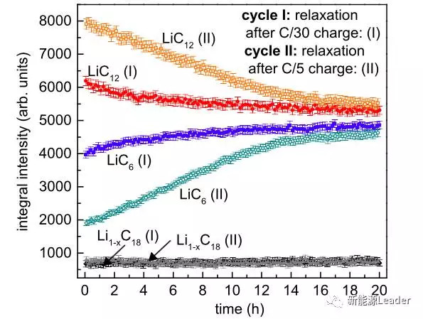 下图为充电后和搁置20h后石墨负极的物相结构图,可以看到在刚刚充电结束时,两种充电倍率下,石墨负极的物相有很大的区别。C/5大倍率下,石墨负极中LiC12的比例较高,LiC6的比例较低,但是在静置20h后,两者之间的区别已经变的非常小。