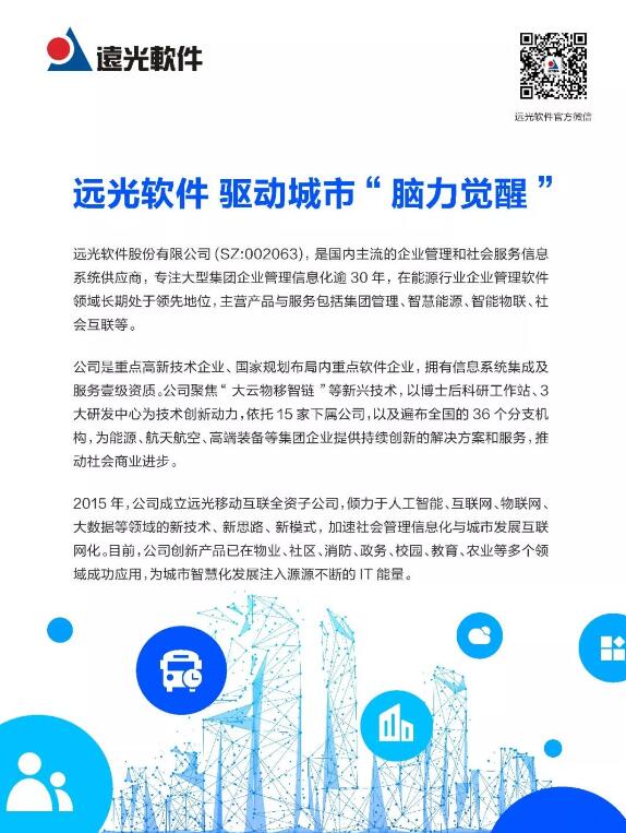 远光软件专注大型集团企业管理信息化逾30年,长期为国家电网有限公司、中国南方电网有限责任公司、厦门航空有限公司等大型央企集团提供产品和服务,沉淀下深厚的技术根基和实践经验。随着技术的创新以及业务的发展,远光软件在社会互联领域的业务布局日渐完善。2015年,公司成立远光移动互联全资子公司,倾力于互联网、物联网、智联网等领域的新技术、新思路、新模式的探索与研发,借鉴企业管理中的先进经验和模式,为社会治理智能化与城市发展互联网化提供创新解决方案。