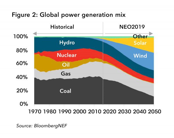 根据彭博新能源财经(BNEF)的最新预测,到2050年,风能、太阳能和电池技术成本的大幅下降,将导致电网由这两种快速增长的可再生能源提供近一半的电力。在《2019年新能源展望》(NEO)中,BNEF认为这些技术将确保——至少到2030年——电力行业为防止全球气温上升超过2摄氏度做出自己的贡献。[1]