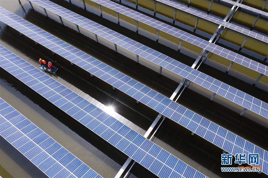 4月16日,空中俯瞰古龙村的“渔光互补”项目现场(无人机照片)。近期,在浙江省长兴县洪桥镇古龙村的“渔光互补”项目现场,光伏板下的鱼塘中养殖的淡水鲈鱼和小龙虾陆续上市,成为当地养殖户的重要增收来源。该“渔光互补”项目占地500亩,水上光伏板发电,水下鱼塘养殖鲈鱼、鲫鱼、小龙虾等,“一地两用”极大提高单位面积土地的经济价值。该光伏发电项目年发电量可达2000多万千瓦时,每年可获得售电收入1000多万元,鱼虾养殖年收入200多万元,达到一地两用、助农增收的效果。