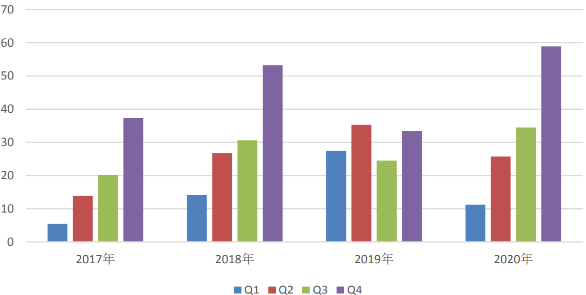 2017-2020年我国新能源汽车季度销量情况(单位:万辆,Q4为预测值)数据来源:中汽协