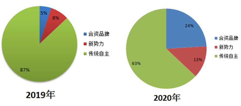 2020年不少自主品牌纯电动乘用车一改国货廉价形象,成功的提高了自身品牌价值,向高端进发,基本告别以往靠A0级撑量的状态,在毛豆3,汉EV,蔚来ES6和小鹏P7等热门车型带动下,纯电动B级车份额大幅提升至22%以上,较2019年2.56%提升了近20%。