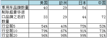 注:1、美国、欧洲、日本数据均为2018年,中国数据为2019年10月;2、国内乘用车品牌数计算:一汽大众和上汽大众均算作大众品牌;3、美国区域仅包含轿车;欧洲数据来自于欧盟和欧洲自由联盟协会成员国数据之和;日本统计范围为普通乘用车,不包含小型乘用车。