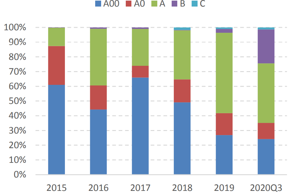 2020年1-9月,我国新能源汽车累计销量达到71.4万辆。而且,从销量结构来看,用于私人消费和出行市场的新能源乘用车已经占绝对主力,新能源商用车累计销量才7万辆,占比从2015年的37%下降到了9.8%。新能源乘用车作为大众消费的市场,销量表现决定了整体行业的情况。而B端2020需求较弱主要原因在于2019年受地方出租车、网约车电动化政策刺激,出现了抢装机的现象,占比大幅提升至28.8%;2020年由于疫情影响公共出行需求,需求大幅减少。