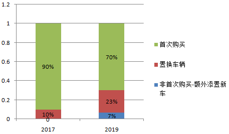 而这种趋势并非空穴来风。麦肯锡在2019年的调查数据显示,在受访的购车者中,置换或买第二辆车的比例高达30%,比2017年提高了20%。此外,在购置下一辆车时,70%以上的受访者会选择购买更高端的车型。