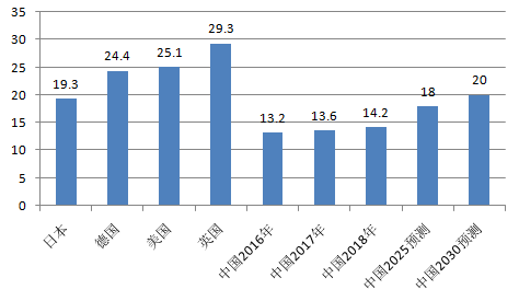 各国2018年新车销售均价,中国2016-2018新车销售均价及预测(万元)