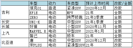 展望2021年,是真正的百舸争流千帆竞,乘风破浪正远航。不论是自主品牌,合资品牌还是造车新势力,都将推出多款电动车,其中大众MEB平台车型ID4、吉利ZeroConmcept都是比较值得关注的。其中ZeroConmcept拥有5米长度,3米轴距和超长续航,值得期待。长安UNI-K将推出PHEV版本。长城11月已经上市欧拉好猫,上汽2020年底将上市MarvelR,预售22万起,2021年新品牌智己汽车也将上市首款轿车。比亚迪预计12月将上市唐EV改款车型,2021年还将上市宋PLUS改款车型。