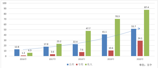 本月,中国电动汽车充电基础设施促进联盟发布的《2020-2021年度中国充电基础设施发展报告》(以下简称《发展报告》)显示,2020年,我国充电基础设施建设规模持续高速增长,截至2020年底,公共充电桩保有量数量79.8万个,私人充电桩数量87.4万个,建设规模持续保持世界首位。