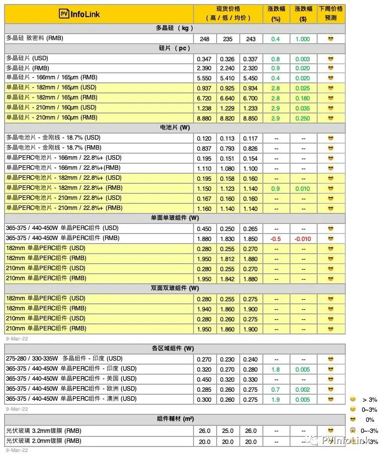 3月9日,PVInfoLink发布光伏产业链最新周价格汇总,上游硅料、硅片环节价格再次上涨。
