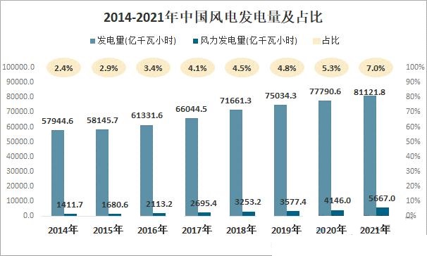 近年来,我国风电发电量占比不断提升,2021年中国风电发电量占总发电量的7.0%,较2014年提升4.6个百分点,发展前景十分广阔。