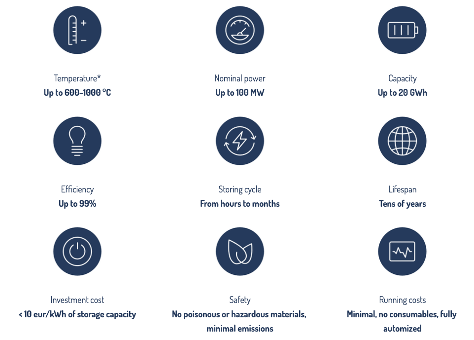 该公司在电视采访中告诉记者,装置的效率非常高。极夜能源首席技术官马库·伊洛宁(Markku Ylönen)说,“把电能转化为热能很容易”,但把热能转化为电能,需要汽轮机和更复杂的东西。如果只是用于供热、采暖,非常简单。该公司声称装置的效率因子高达99%,能以最低损耗持续储热数月,寿命长达几十年。