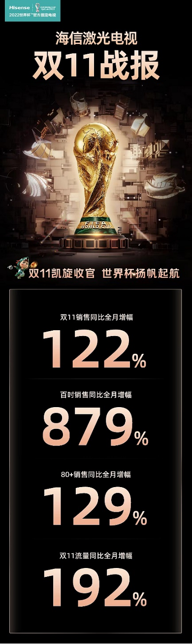 今日,海信激光电视公布今年双十一战报:双十一期间,海信激光电视销售同比全月增长122%。其中,100英寸激光电视同比全月增幅高达879%,80+英寸激光电视销售同比全月增幅达129%。双十一期间,海信激光电视流量同比全月增幅192%,取得亮眼成绩。