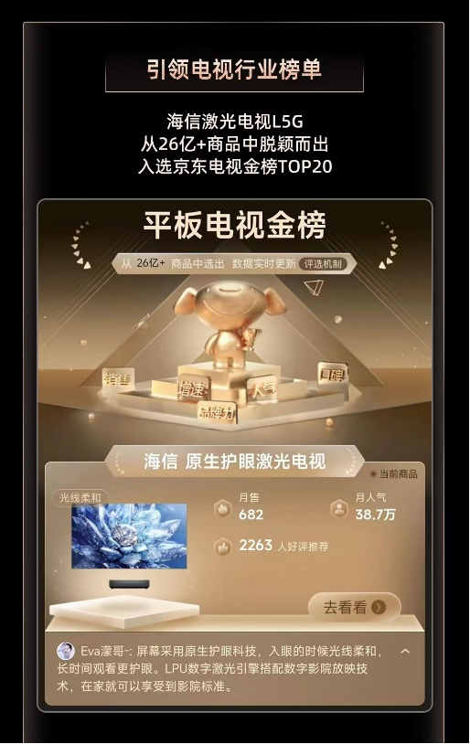 同样值得注意的是,海信激光电视L5G还荣登京东平板电视金榜。京东金榜是以京东大数据为基础,结合销售、增速、口碑、品牌、热度等5大维度、数十项数据指标评选出的行业顶尖产品,旨在为消费者指明未来消费趋势和潮流走向,为消费者提供消费参考。其中,消费者对品牌的认同以及产品口碑,成为登录京东金榜的关键。