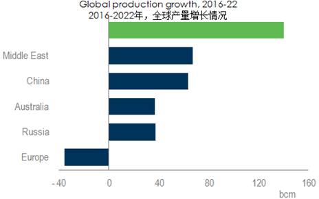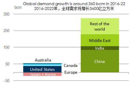 在供应方面,美国现在已经是世界上最大的天然气生产国,美国目前的增长速度也是全球最高的,到2022年,美国将占全球产量增长的40%。此外,中东地区产量将继续增长;中国也将成为第四大天然气生产国。
