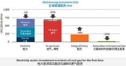 2016的全球能源投资为1.7万亿美元,占全球国内生产总值(GDP)的2.2%。其中,电力部门投资首次超过石油、天然气和煤炭的投资总和,而清洁能源的投资占总投资的43%,创历史新高。