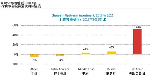 《报告》显示,在经历了两年史无前例的下降后,全球石油和天然气上游的投资预计将在2017稳定下来。然而,美国页岩气投资的上升与世界其他地区的停滞形成对比,这预示着石油双速市场的出现。与此同时,石油和天然气行业正在通过大量的成本节约、技术开发以及高效的项目执行来取得改观。