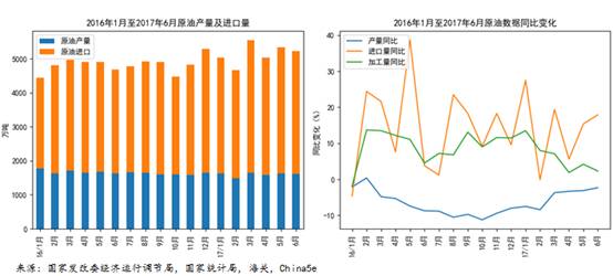成品油方面,成品油消费量平稳增长,预计2017年全年成品油消费量同比增长≤5%(2016年为5.0%);为消纳过剩产能,成品油出口增速曾远高于产量、消费量增速,但受出口配额收紧等因素影响,二季度大幅回落;企业加工贸易出口方式受限,可以看出政府不鼓励大量进口原油用于加工出口。