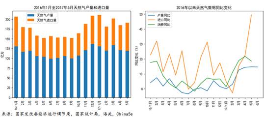 天然气行业,受经济好转、煤改气政策、点供快速发展等因素影响,2017年以来,天然气产量、消费量、进口量同比均有大幅攀升,前5月对外依存度略高于2016年,超过35%;根据中石油专家数据,2017年上半年全国天然气表观消费量1160亿立方米,同比增加13.5%;二季度消费量同比增加19.4%;预计下半年增长势头会小幅放缓。