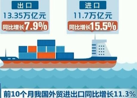 前10月我国外贸进出口增长11.3%据海关统计,今年前10个月,我国货物贸易进出口总值25.05万亿元,比去年同期增长11.3%。其中,出口13.35万亿元,增长7.9%;进口11.7万亿元,增长15.5%;贸易顺差1.65万亿元,收窄26.1%。 [详细]